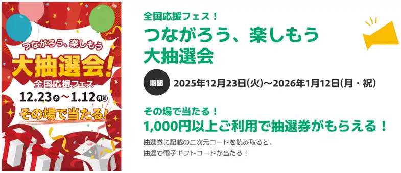 1,000円以上ご利用の方に抽選券を配布。二次元コードを読み取ると、その場で電子ギフトコードが当たるチャンス! |