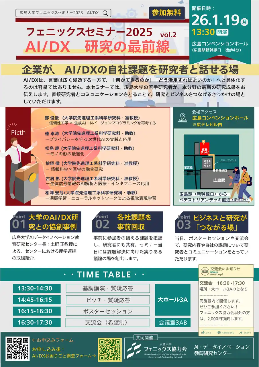 AI/DXは、言葉は広く浸透する一方で、「何ができるのか」「どう活用すればよいのか」へと具体化するのは容易ではありません。本セミナーでは、広島大学の若手研究者が、本分野の最新の研究成果をお伝えします。直接研究者とコミュニケーションをとることで、研究とビジネスをつなげるきっかけの場としていただけます。 |
