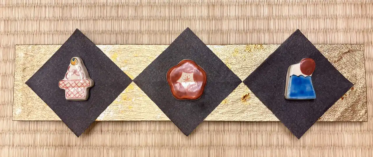 別添えの陶芸箸置き(左から鏡餅、梅、富士山) |