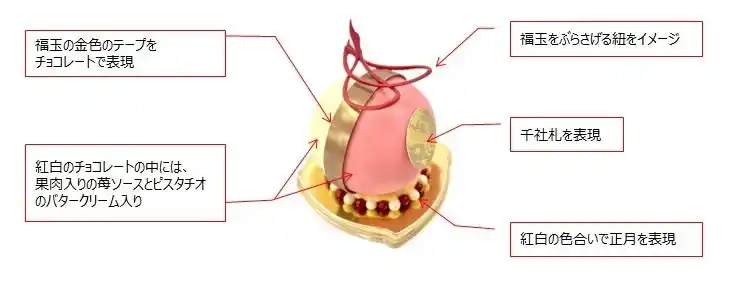 紅白のチョコレートで正月を演出し、中には、果肉入りの苺ソースとピスタチオのバタークリー |