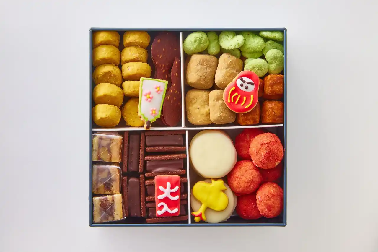 低糖質素材を使用した大人のクッキー缶「朔音(さくのね)」から、ワインやビールにも合う塩味クッキー5品(青唐辛子、花椒チーズ、白味噌トマトなど)を厳選。これに、洋菓子ぎをんさかいの人気商品「洒□(しゃかく)」や「花くるみ」のミニサイズ、さらに期間限定の濃いちご玉、柚子ホワイトを加え、正月モチーフのアイシングクッキーとともに詰め合わせた特別な「初春おせち缶」が登場します。新年を華やかに彩る贅沢なクッキー缶は、お正月のおもてなしやギフトにも最適です。 |