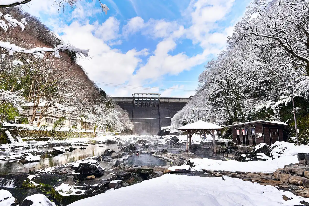湯原温泉のシンボルで、全国の温泉のうちわずか1%しかないとされる川底から湧き出る源泉100%の湯舟もある大露天風呂。美人の湯・子宝の湯・長寿の湯という、温度の異なる湯舟を楽しむことができます。 誰でも24時間無料で入浴可能で、ダムや川が間近に迫る絶景の中温泉を楽しめます。 |