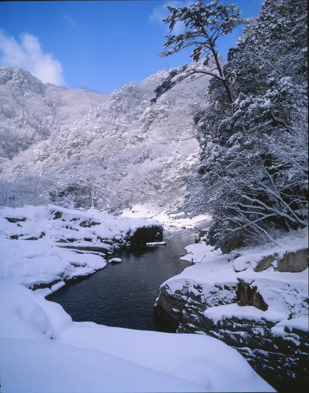 ■雪化粧した渓谷美「奥津渓」 |