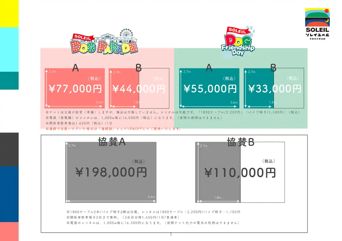 | 四季折々の花が一面に咲き誇る絶景のロケーションが魅力的なソレイユの丘で、出店してみませんか。毎回大好評のドッグイベントを、是非一緒に!さらに盛り上げていきましょう。 | ||||||||||||||||||