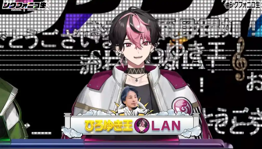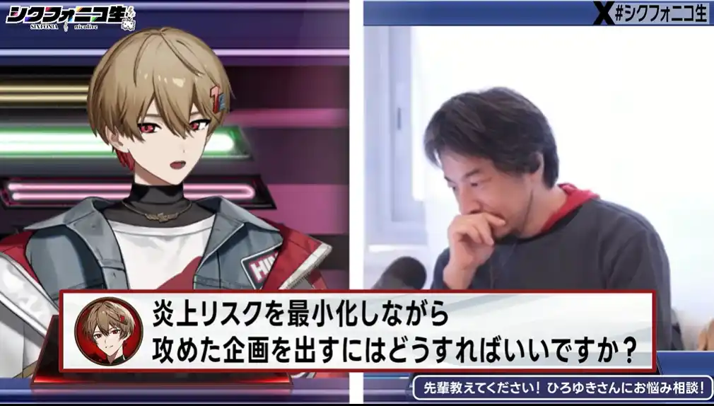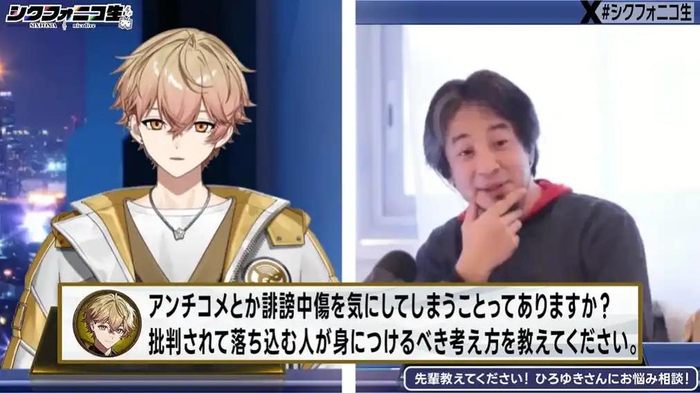 前半のコーナーは「先輩教えてください!ひろゆきさんにお悩み相談!!!」。シクフォニメンバー6人からそれぞれ、ひろゆきへ悩みを相談し、ひろゆきの広い知見からズバッと回答してもらいます。MCの鬼龍院がコーナーを進行しようとすると、ひろゆきから「鬼龍院さんMCやってるの新鮮な感じがしますね」と触れられると、鬼龍院は「音楽だけでは厳しいと最近気づき始めて…」と返し、視聴者からの笑いを誘いました。 |