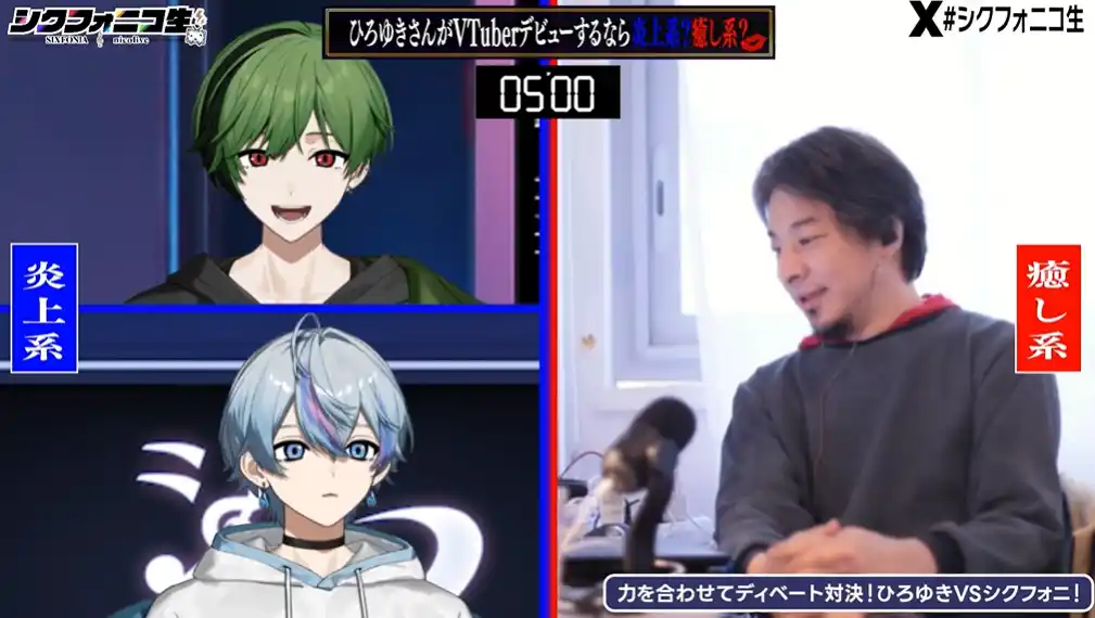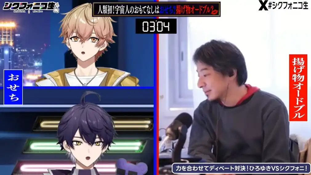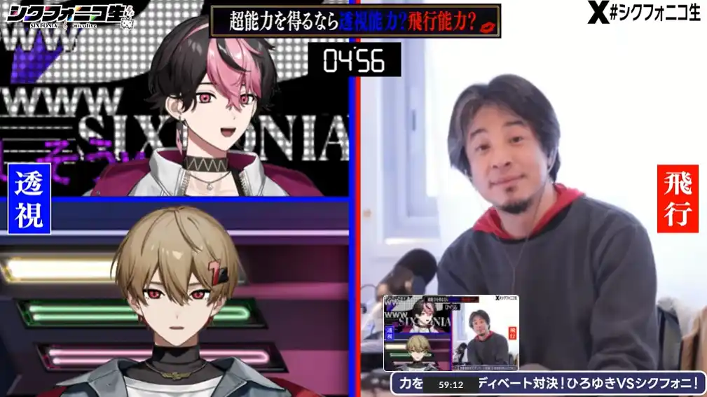 ニコニコプレミアム会員限定の後半パートは、「力を合わせてディベート対決! ひろゆきVSシクフォニ!!!」でひろゆきと直接対決。暇72とLANは「超能力を得るなら、『透視能力』か『飛行能力』か」、雨乃こさめとすちは「ひろゆきさんがVTuberデビューするなら『炎上系』か『癒し系』か」、いるまとみことは「人類で初めて宇宙人をもてなすことになったら振る舞うべきは『おせち』か『揚げ物オードブル』か」というテーマでそれぞれがディベート対決。 |