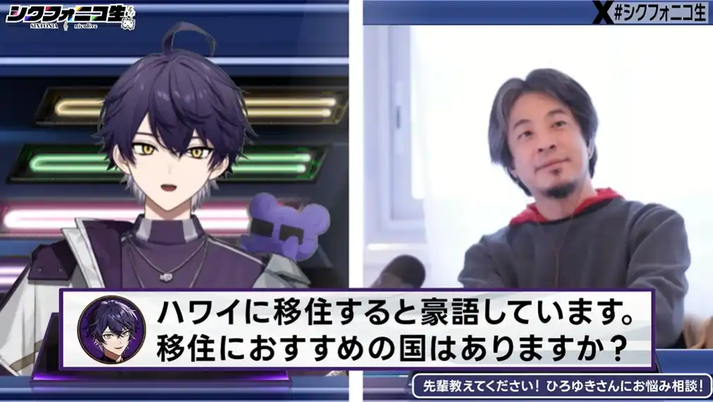 いるまからの相談は「落ち着いたらハワイに移住すると豪語しています。移住におすすめの国はありますか?」。これにひろゆきは「移住したいって言ってる人って、多分行かないですね」と即答。「この番組もハワイからでも出演できるでしょ。行こうと思えば行けるのに行ってないという選択をしちゃってるんですよね」というひろゆきの鋭い言葉に視聴者も「面白すぎるwww」「あっwww」と大盛り上がり。続いて暇72は「炎上リスクを最小化しながら攻めた企画を出すにはどうすればいいですか?」と相談。 |
