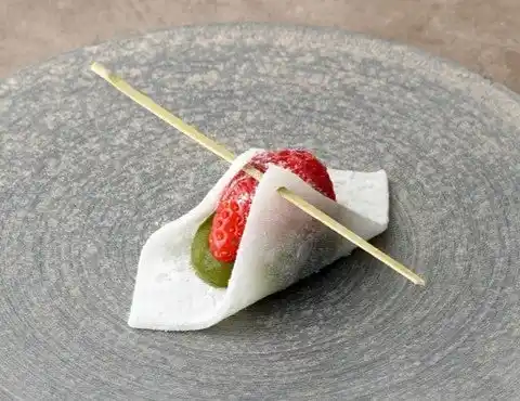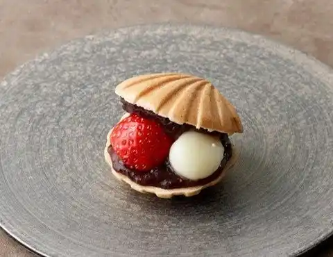 三重県産いちご「かおり野」をまるごと一粒包み込んだ、貝モチーフの最中です。やさしい甘さの粒あんに、いちご、真珠をイメージした白玉が並び、志摩ならではの物語を感じる和スイーツに仕上がりました。 |
