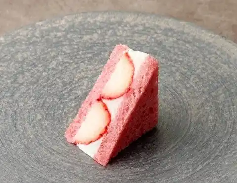 ラズベリーとビーツが練り込まれた、香り豊かな国産小麦パンで作ったフルーツサンド。真っ赤な外皮と白い果肉のコントラストが特徴の三重県産いちご「かおり野」ならではの、断面の美しさも楽しめるサンドウィッチです。 |