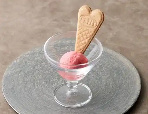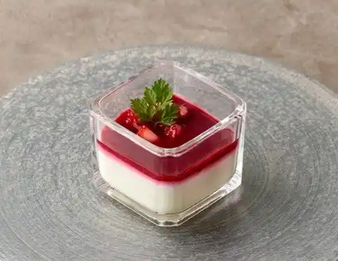 もちもちとした独特の食感が楽しい、グラス仕立てのパンナコッタです。濃厚な味わいに寄り添うのは、爽やかな酸味が広がるラズベリーソース。甘みと酸味、赤と白――それぞれのコントラストが際立つ、見た目にも華やかな一品です。 |