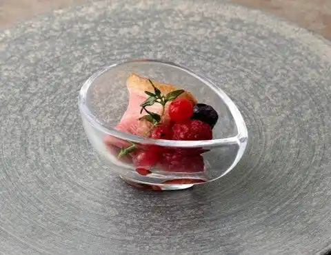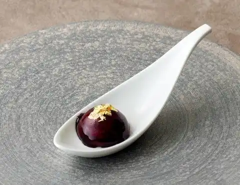 低温でじっくり火入れした伊勢どりに、生クリームとハーブを合わせてなめらかな一口ムースに仕上げました。ポルト酒のジュレでコーティングし、金箔をそっとあしらった、見た目も味わいも大人の一品です。 |