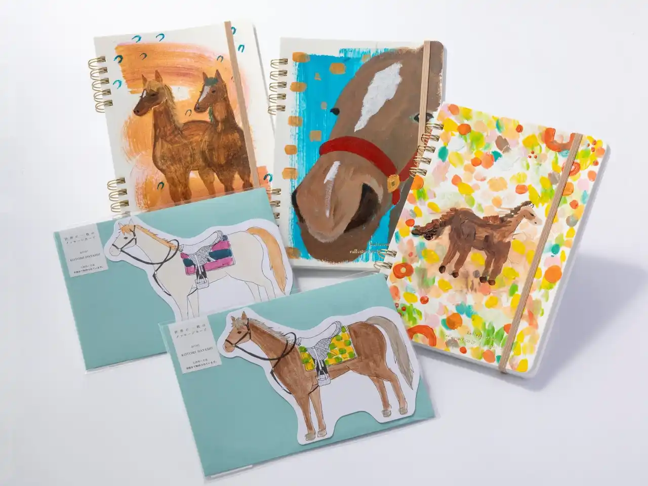 「午」をモチーフにさまざまなアーティストが手描きした、一点もののリングノート・メッセージカードです。絵の具の質感に温かみが感じられ、一枚一枚手描きで着色しているので馬の色や模様がすべて違います。カードの見開きの片側には馬の骨格図が描いてあるところもポイントです。 ぜひお気に入りを見つけてみてください。 |