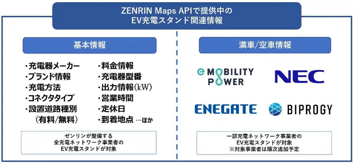 株式会社ゼンリン(本社:福岡県北九州市、代表取締役社長:竹川道郎、以下ゼンリン)は、地図API「ZENRIN Maps API」にて提供中の、満車・空車状況をリアルタイムで確認できる「EV充電スタンド満空情報配信機能」に、新たに株式会社e-Mobility Powerの約25,600口※1の情報を追加しました。これにより本APIは、現在提供中の株式会社エネゲート、日本電気株式会社、BIPROGY株式会社の情報と合わせて、約28,000口※2の満空情報配信が可能な、国内最大規模のサービスとなります。 |
