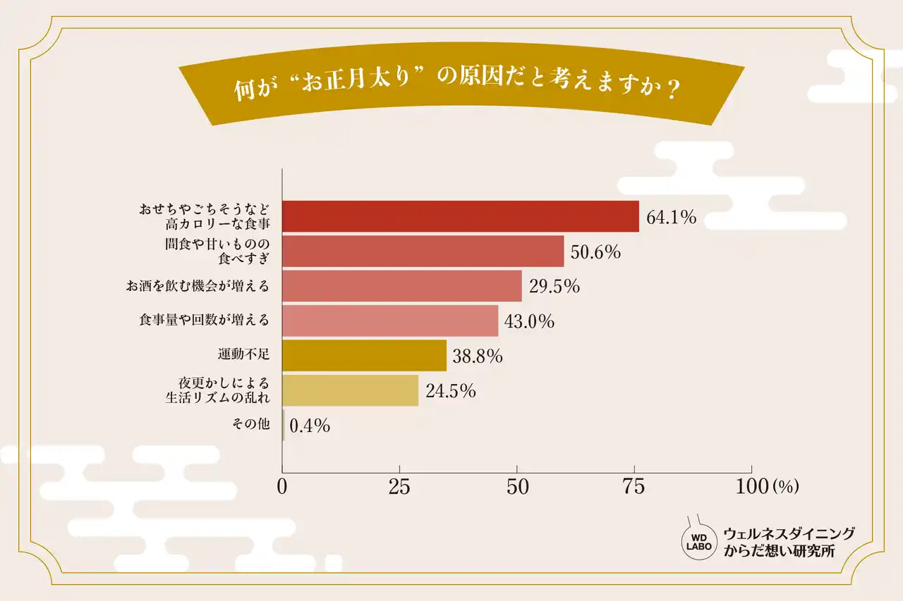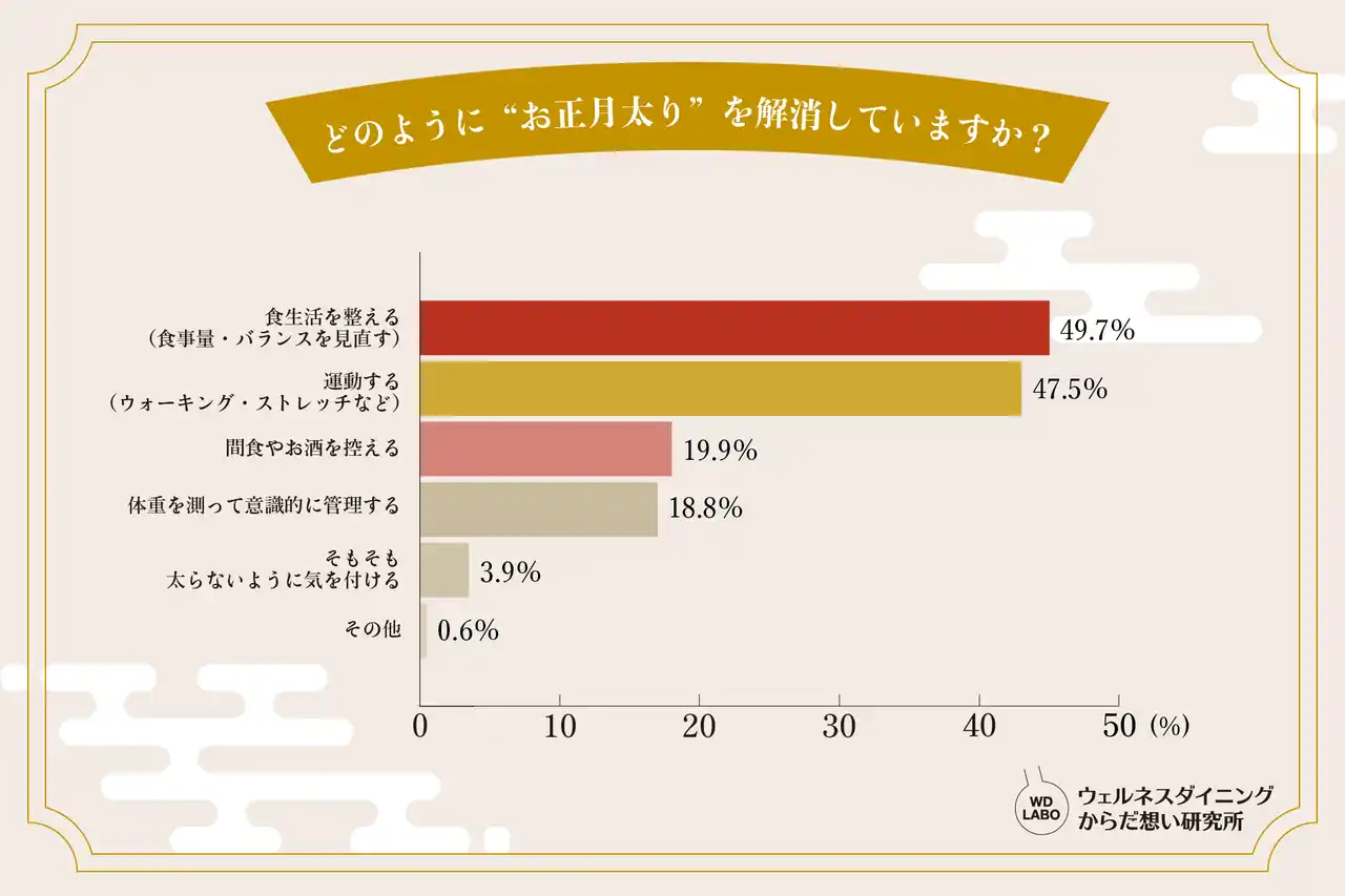 | ウェルネスダイニング株式会社(本社:東京都墨田区、代表取締役:中本哲宏)は、10代から50代の男女を対象に「お正月太りに関する調査」を実施しました。その結果、約6割が「正月太りを経験したことがある」と回答し、原因として「おせちやごちそうなど高カロリーな食事」「間食や甘いものの食べすぎ」「運動不足」などが挙げられました。一方で、解消法としては「食生活の見直し」や「運動」を挙げる人が多く、健康意識の高まりも垣間見える結果となりました。 | |||||||||||||