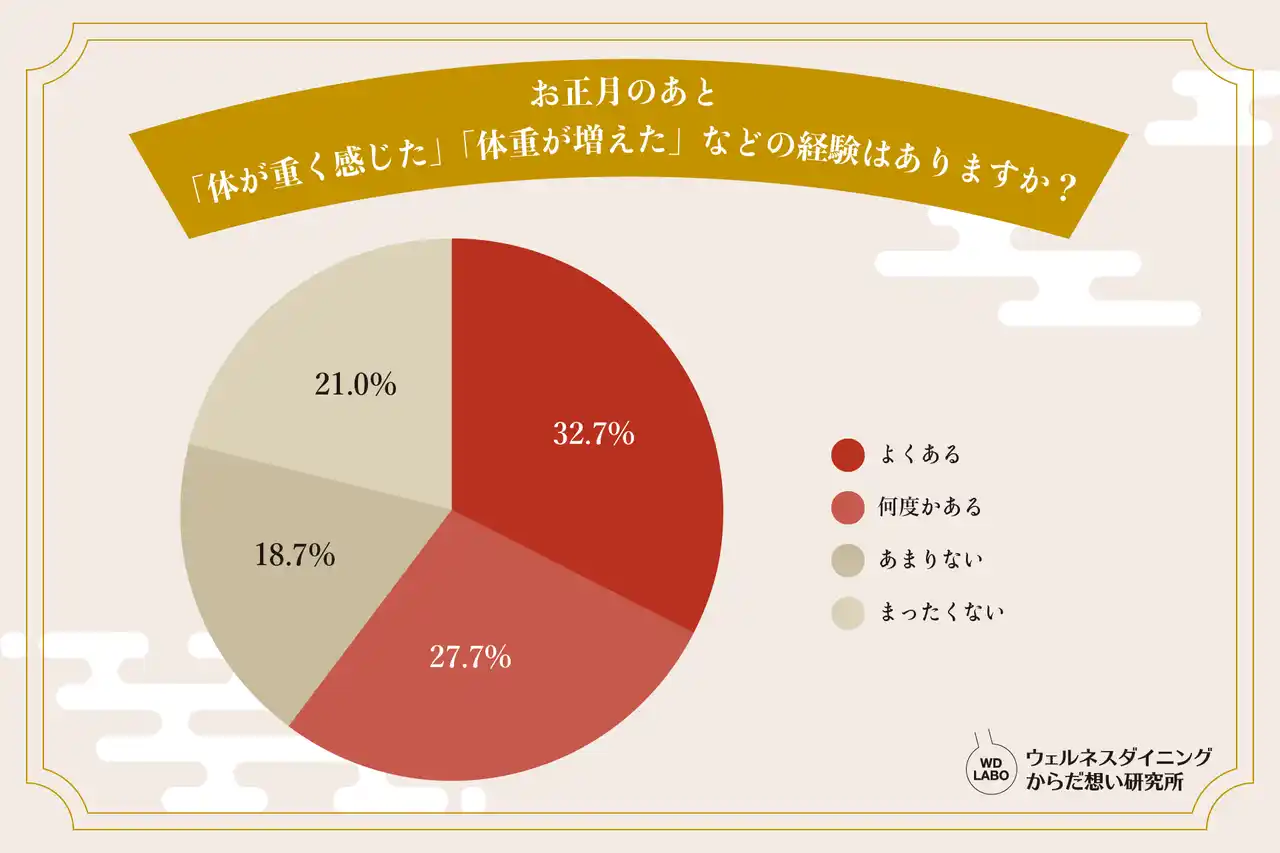 | 年末年始は、普段よりも食べる機会が増え、生活リズムも乱れがち。食べすぎによる体重増加は毎年の“恒例行事”と化しています。本調査では、多くの人が実感する「お正月太り」の実態や、解消に向けた行動、そしてその難しさに迫りました。 | |||||||||||||