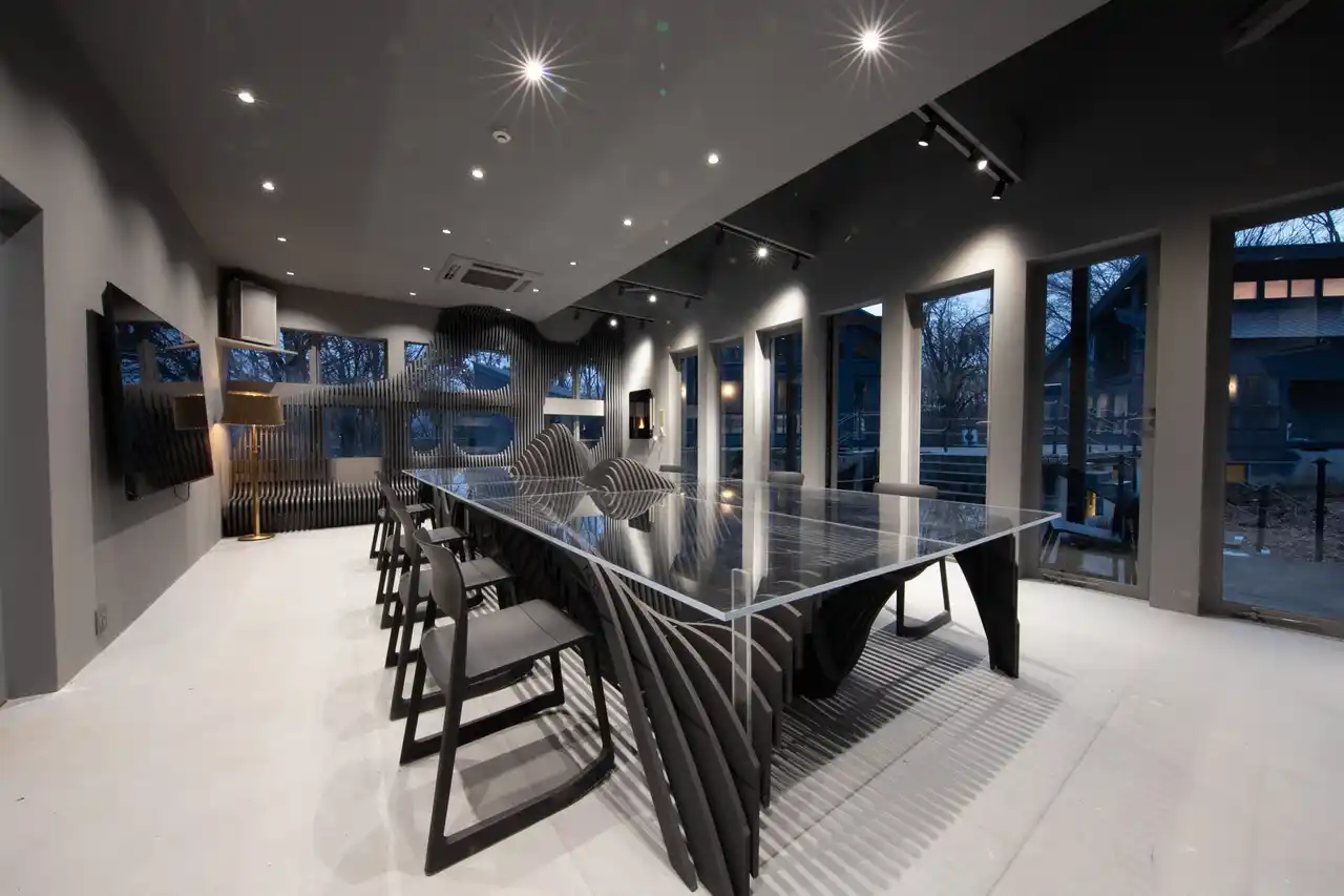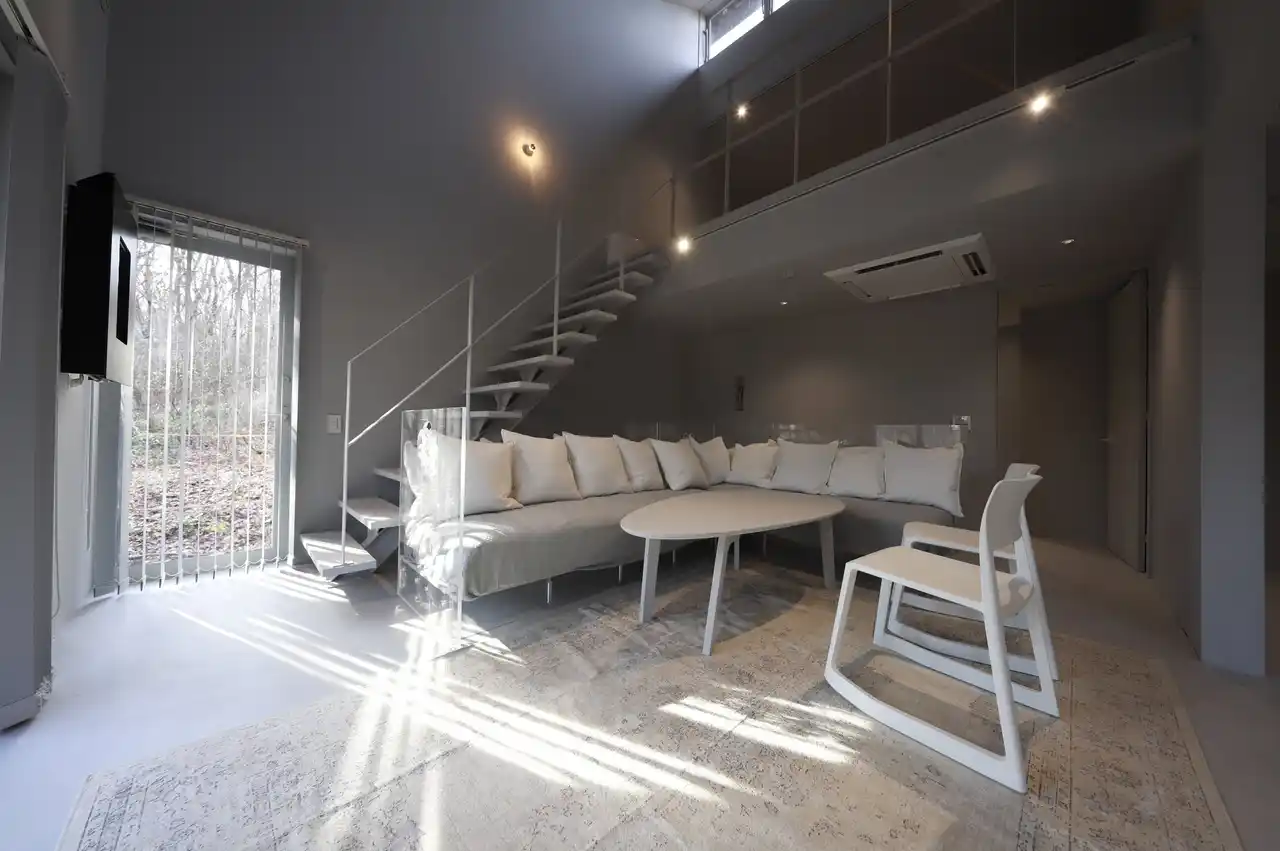 宿泊棟(全7室) 2棟の宿泊棟には、少人数からグループまで、多様な滞在スタイルに対応する全7室の客室をご用意。客室はすべてメゾネットタイプで、2名向けのコンパクトな客室から、最大10名まで泊まれるゆとりある客室まで幅広いタイプを展開します。雪と森を望む落ち着いた空間は、白・グレーなどミニマルながら部屋ごとに異なる表情を持ち、滞在そのものがサウナ体験の余韻を深めます。また、永棟の2つの客室には、ゆとりあるプライベートサウナを備えています。 |