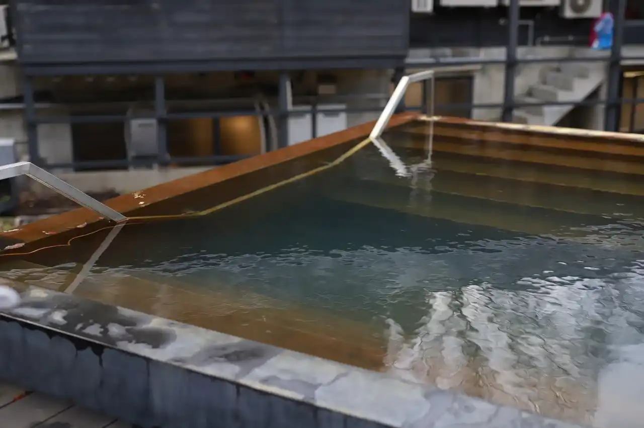 サウナの目の前には、天然の井戸水を引いた大きな水風呂を備えています。鉄分を豊富に含んだ”鉄水風呂”は、やわらかな冷感と肌にまとわりつくような独特の感触が特徴。温冷のコントラストをより立体的に引き立て、深く息をつくような心地よさをもたらします。 |