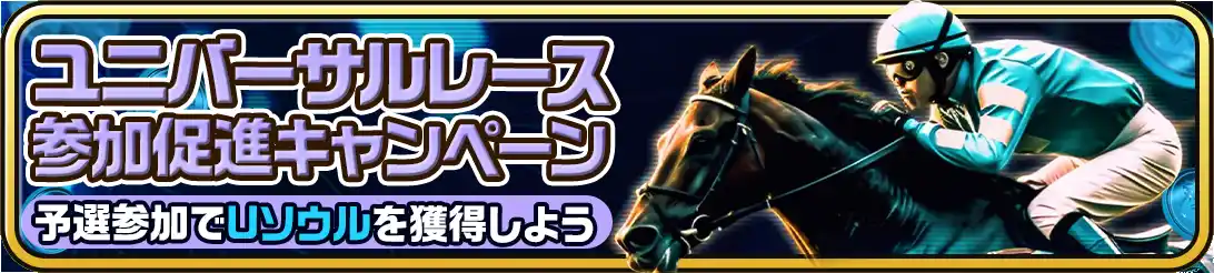 期間中、「ユニバーサルレース」に参加すると、通常の賞金に加え、 10着以下になった場合でも“参加賞”として20Uソウルを獲得できるキャンペーンを実施します。 |