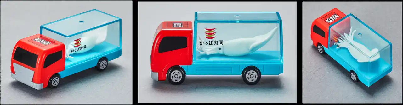 今回は、かっぱ寿司限定のオリジナルミニカー*「トラック(暗いところで光るいか)」と「ターレー(ぴちぴち動くまぐろ)」の 2種類を同時に展開します。お会計税込3,500円以上ご利用いただき、レジにてかっぱ寿司公式アプリ内の「バーコード付引換券」をご提示いただいたお客様に、ご希望の景品を1台プレゼントいたします(※税込3,500円毎に1台のお渡しとなります)。 |