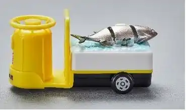 ターレーの車輪が動くと“まぐろ”がぴちぴちと上下に躍動します |