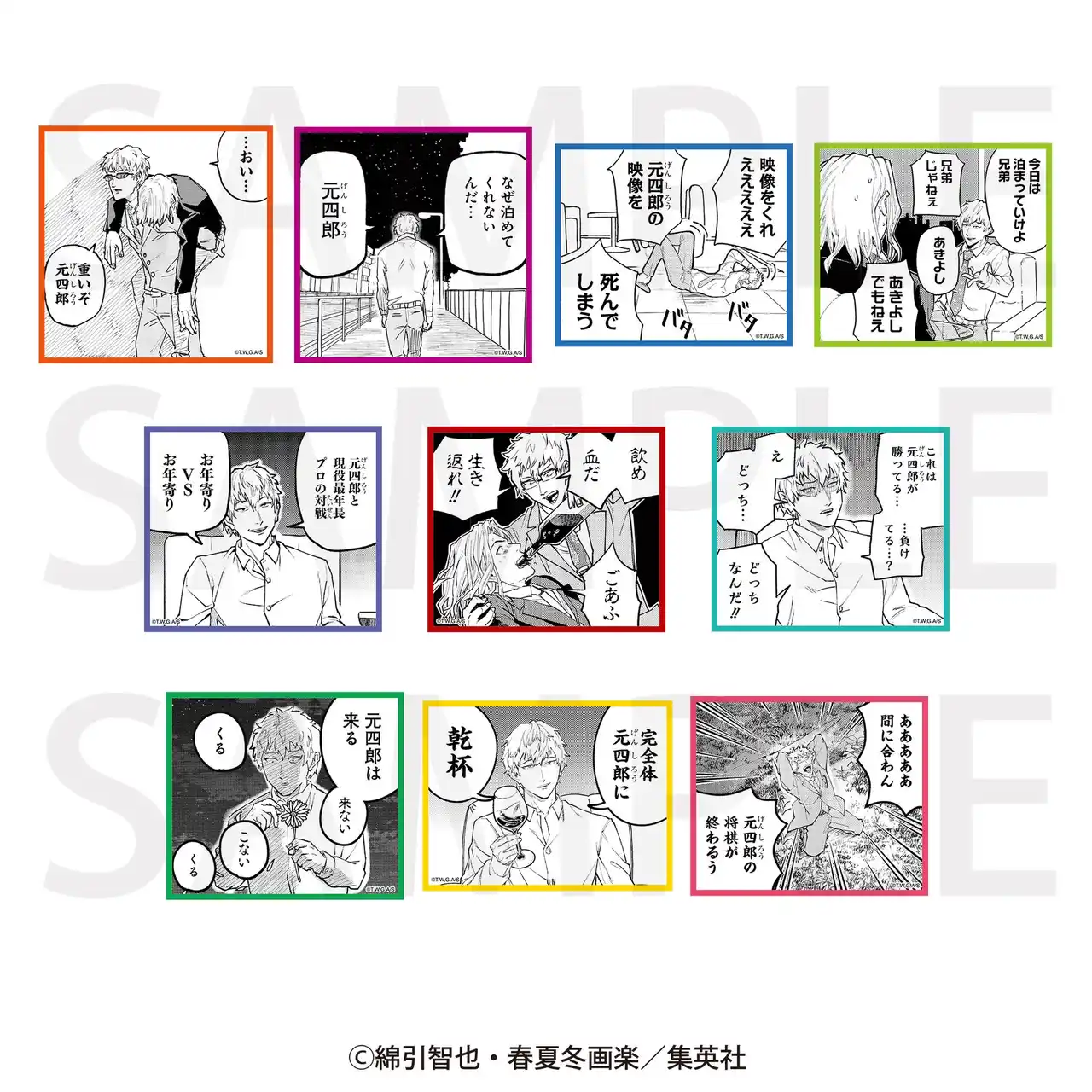 ラインナップ:「重いぞ元四郎」「なぜ泊めてくれないんだ・・・」「死んでしまう」「あきよし」「お年寄りVSお年寄り」「生き返れ!!」「どっちなんだ!!」「花占い」「乾杯」「元四郎の将棋が終わるう」[全10種] |