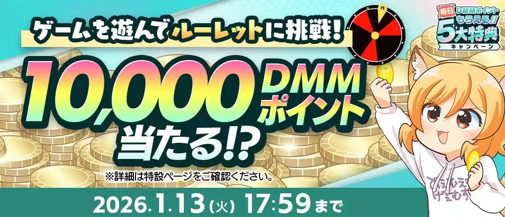 ゲームログインやピックアップタイトルのゲームを遊ぶともらえるルーレットメダルを集めて、最大10,000DMMポイントがもらえるルーレットに挑戦ができます。 |