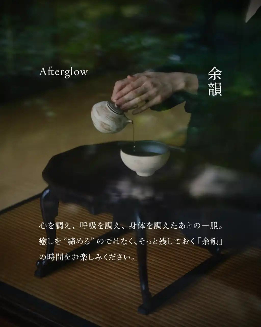 茶室の静けさと、呼吸の深まり、お茶の香りに耳を澄ませ、富士山の雪解け水に身をゆだねる時間。ukaのトリートメントと、静岡ならではの“茶ロウリュ”が重なり合い、心と体をひとつに整えていく。 ここでしか体験できない、新しいスパプログラムです。 |