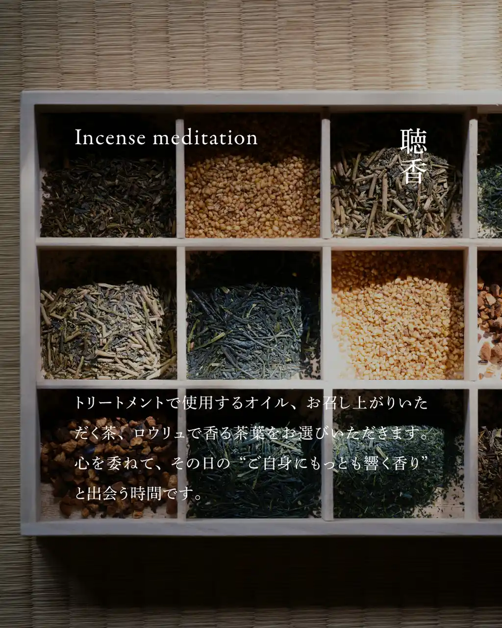【茶禅房(ちゃぜんぼう)特別トリートメント】 本プログラムでは、背中を中心に、足元、腹部、デコルテ、頭部へと全身にアプローチを行います。肋間筋や横隔膜をやわらかく解きほぐし、深く呼吸できる身体の土台を整え、足元へのアプローチでは、軸の通った姿勢をつくり、禅的な呼吸をさらに深めやすくし、日常でも整った状態を保ちやすくケアします。腹部へのアプローチでは、固くなりがちな横隔膜まわりを丁寧にゆるめ、内側からの呼吸の広がりをサポート。デコルテや腕まわりは、浅い呼吸によって緊張しやすい胸部や肩をゆるめ、内に巻きがちな腕の可動を広げることで、上半身全体に軽やかさをもたらします。最後に、ストレスの溜まりやすい頭部を、やさしいタッチでゆるめて深く鎮め、心身を穏やかに仕上げていきます。 |