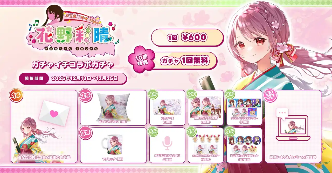 | オンラインガチャプラットフォーム及びリアルガチャ店舗「ガチャイチタウン」を運営する株式会社Iranoan(本社:埼玉県さいたま市、代表取締役:鈴木 直、以下「当社」)とVtuber「花野彩晴」は、この度2025年12月13日から初のコラボレーションイベントを期間限定で開催することをお知らせします。 | |||||||||||
