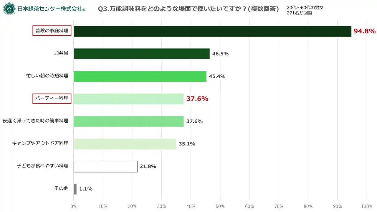 一方で、約3人に1人が【パーティー料理】に使用したいと回答しているのも注目ポイントです。万能調味料は普段の料理シーンはもちろん、味付けに困らずおいしく仕上がるという安心感があり、パーティー料理など特別なシーンでも失敗せず使えそうであるため、使いたいと考える方が多いのだと推察できます。