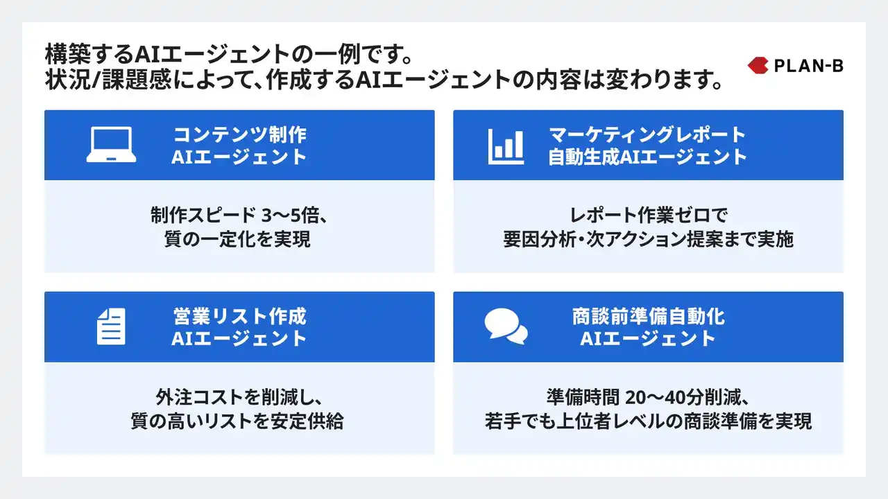 株式会社PLAN-B(東京都品川区、代表取締役:鳥居本 真徳)は、セールス/マーケティングチームの業務プロセスをAIエージェント前提で再設計し、日々の重く属人化した業務を“自動で回るオペレーション”へと変革することを目的とした「AIオペレーション構築サービス」を提供開始いたします。
