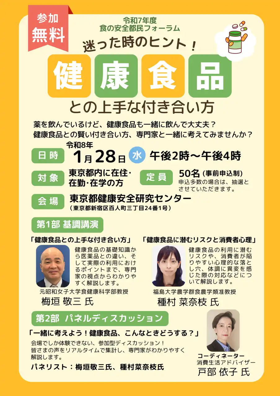 東京都は、都民、事業者及び行政が食の安全に関する情報を共有し、考える場として、毎年「食の安全都民フォーラム」を開催しています。今回は、「健康食品」をテーマに取り上げます。 |