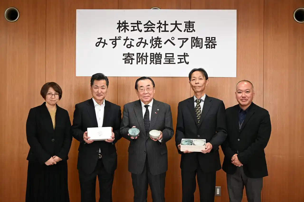 瑞浪市は2025年12月3日、市内陶磁器メーカー・株式会社大恵様より、「みずなみ焼」ペア陶器100組の寄贈を受けました。 |