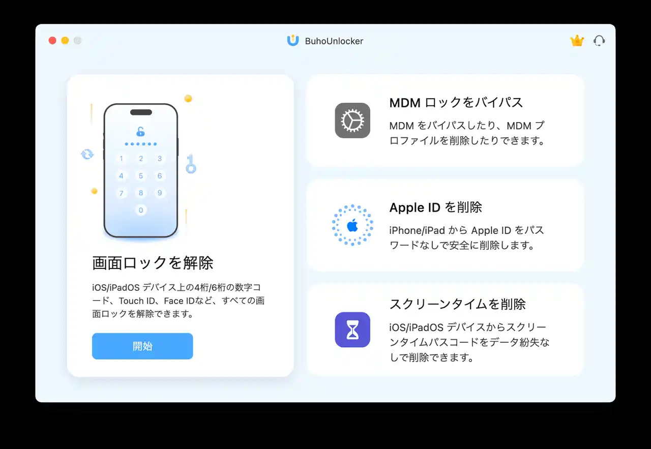 BuhoUnlockerはiPhone/iPad向け、あらゆるもののロックを安全に解除できるソフトです。このソフトであれば、iPhoneの画面ロックを解除したり、スクリーンタイムパスコードを削除したり、MDMをバイパスしたり、Apple IDを削除したりすることができます。iPhoneのパスコードを忘れたら、在宅で自分で処理できます。 |