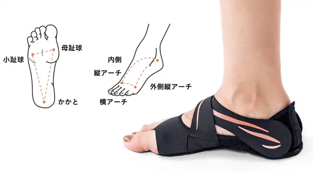 履いた瞬間に沈みがちな足裏アーチを引き上げます。足裏アーチは歩行時に地面から受ける衝撃を受け止めるバネのような働きがあります。足裏アーチが正しく機能せずウォーキングやランニングを続けていると、足だけではなく全身へ衝撃が伝わり、関節の不調につながることもあります。 |