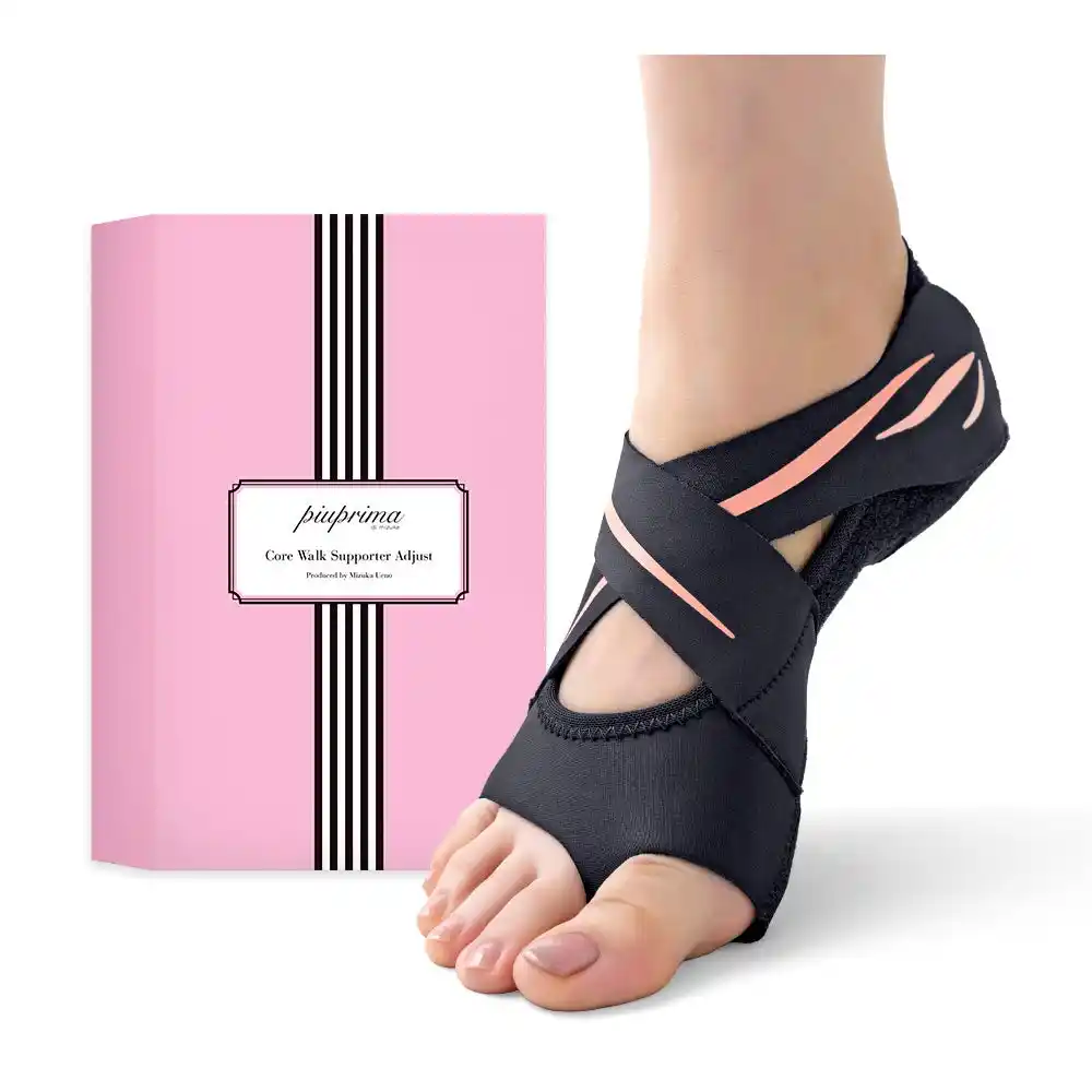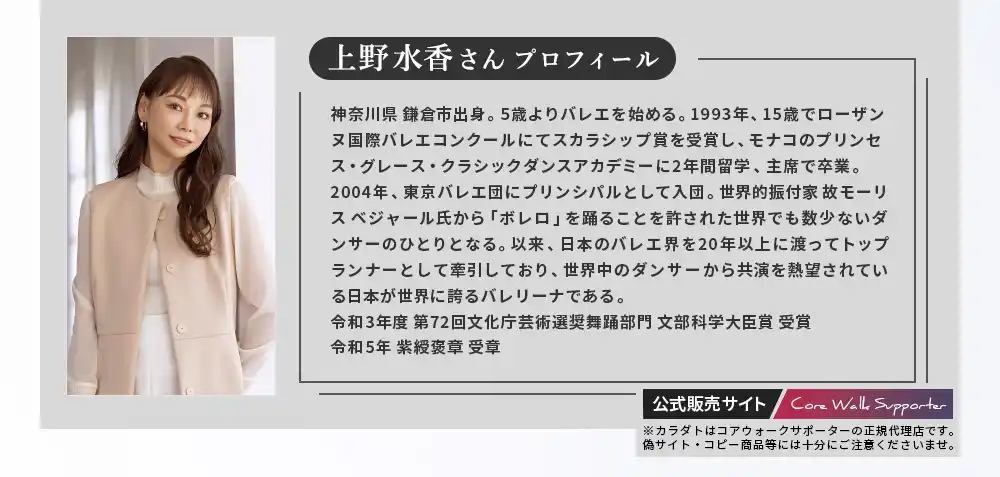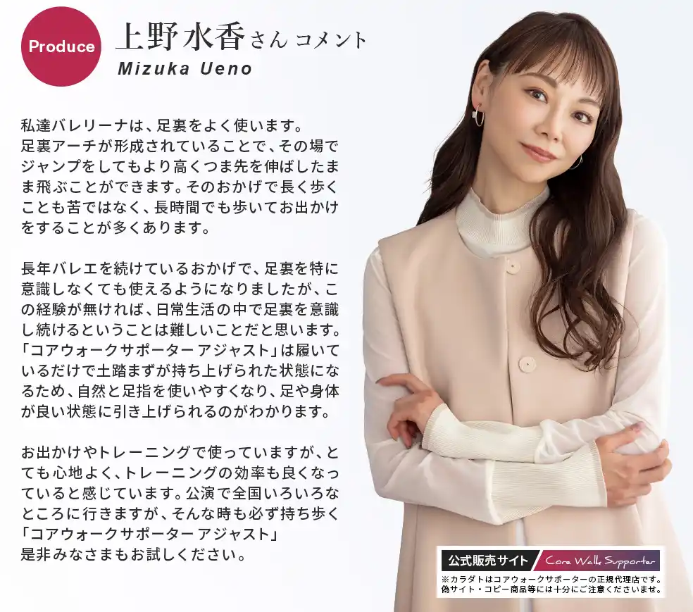 世界的トップバレエダンサーの上野水香が監修。身体を美しく正しく使えるようにバレエダンサーが行う、足指の運動と足裏アーチを形成するトレーニングをもとにコアウォークサポーターアジャストがつくられました。 |