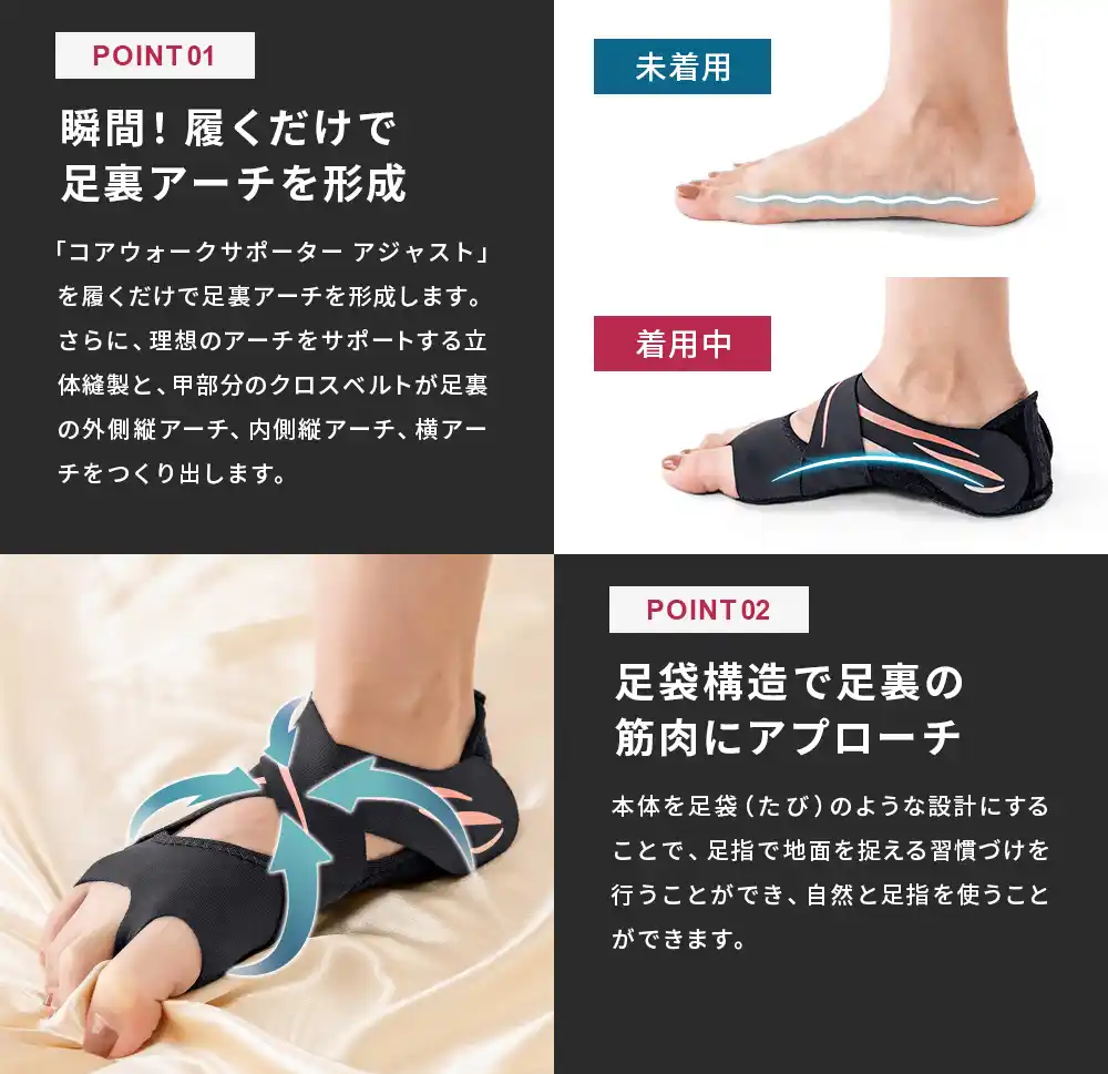 コアウォークサポーターアジャストは、履くだけで足指・足裏の本来持つ機能を高めることを目的につくられたサポーターです。 |