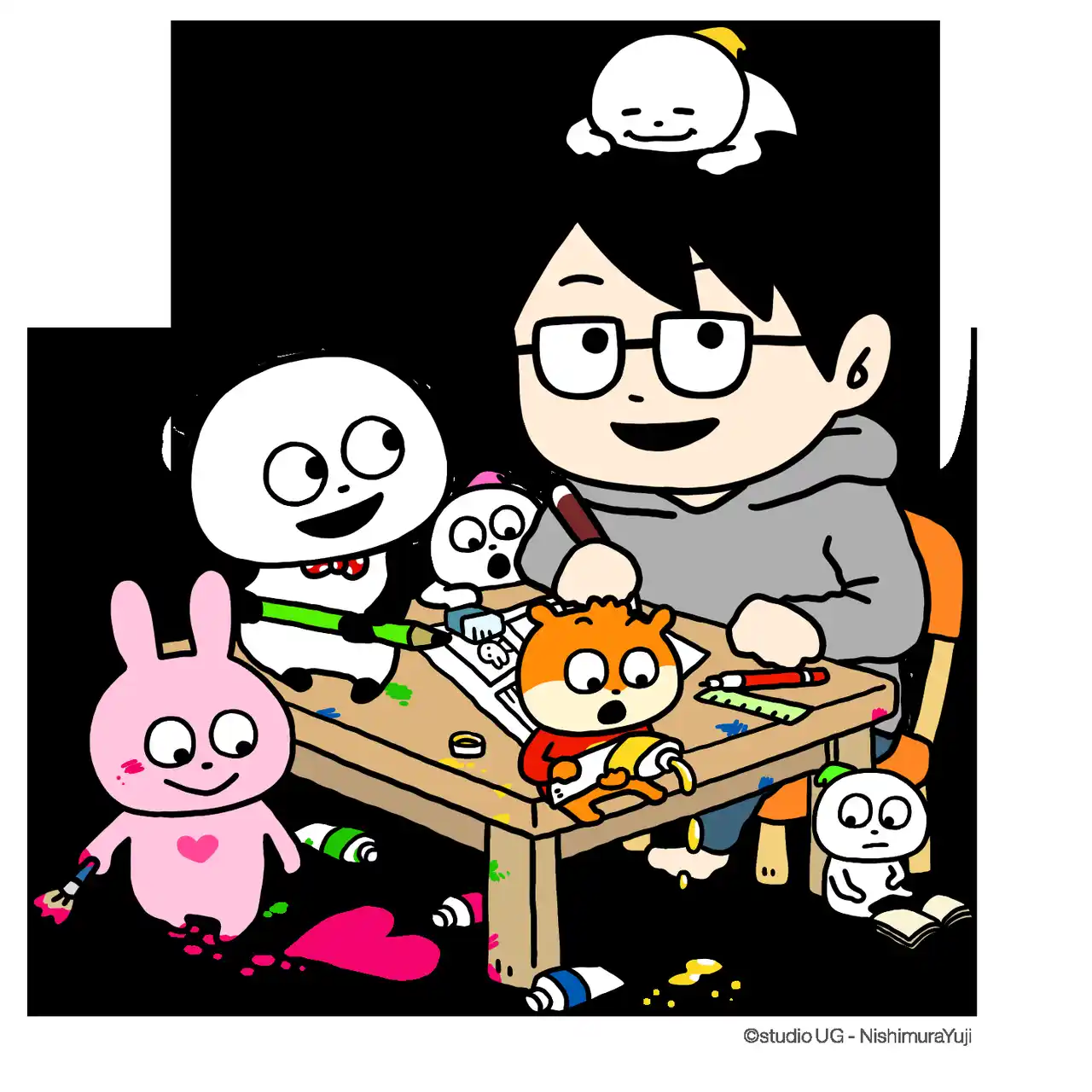 「ごきげんぱんだ」や「こねずみ」「ラブラビット」などの「スタジオUG」の仲間たちを中心に、イラスト作品・まんが作品・アニメ作品を数多く発表している。 |