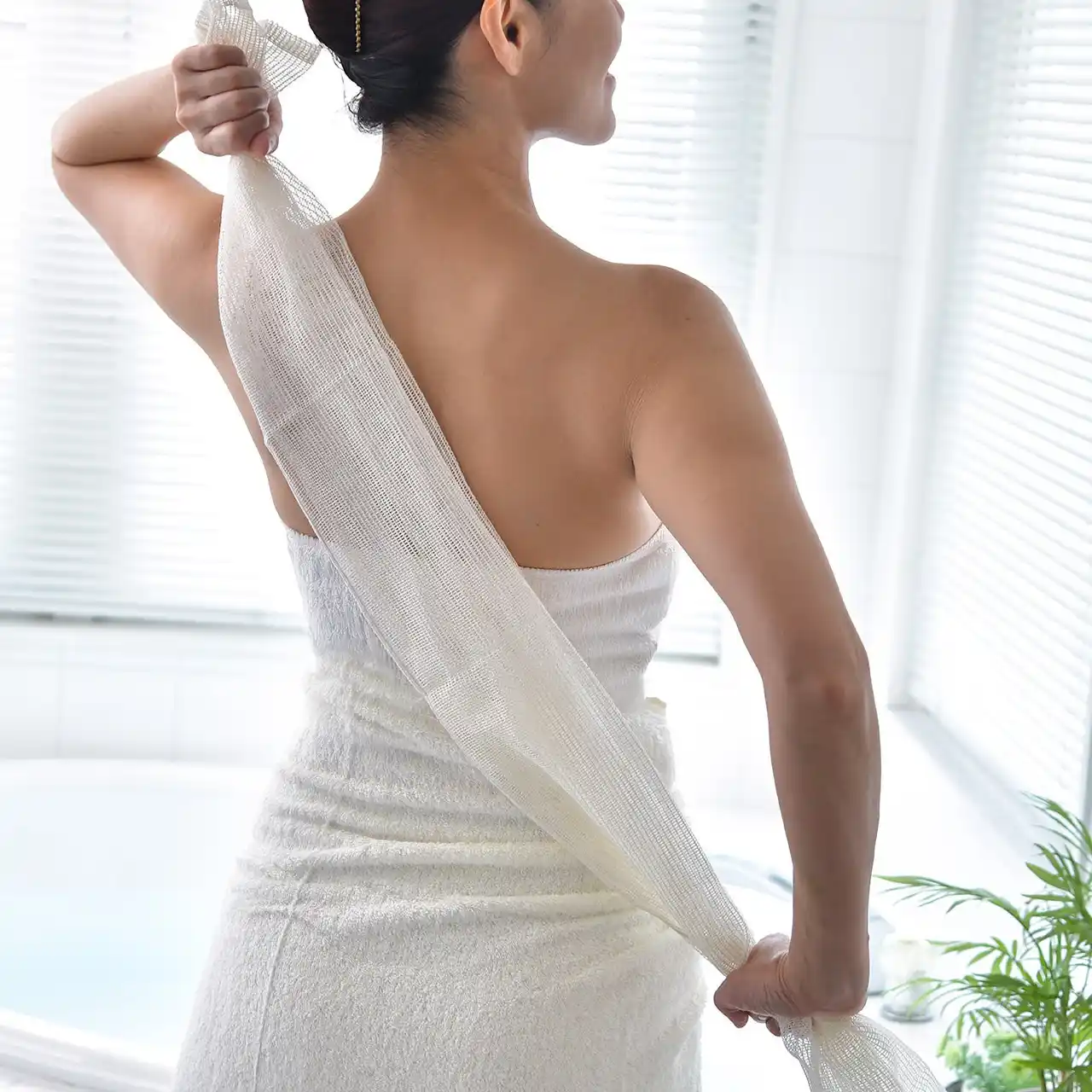 【ラミータオル】 天然素材「麻」を目ズレしない「からみ織」で織り上げた浴用タオルです。 かための麻素材は特有の「シャリ感」が特徴で、さっぱりとした洗い心地を お楽しみ頂けます。入浴時は 1 日の緊張と疲れを癒します。 麻タオルでさっぱりと汚れを洗い流し、明日へのリフレッシュにお役立てください。 |