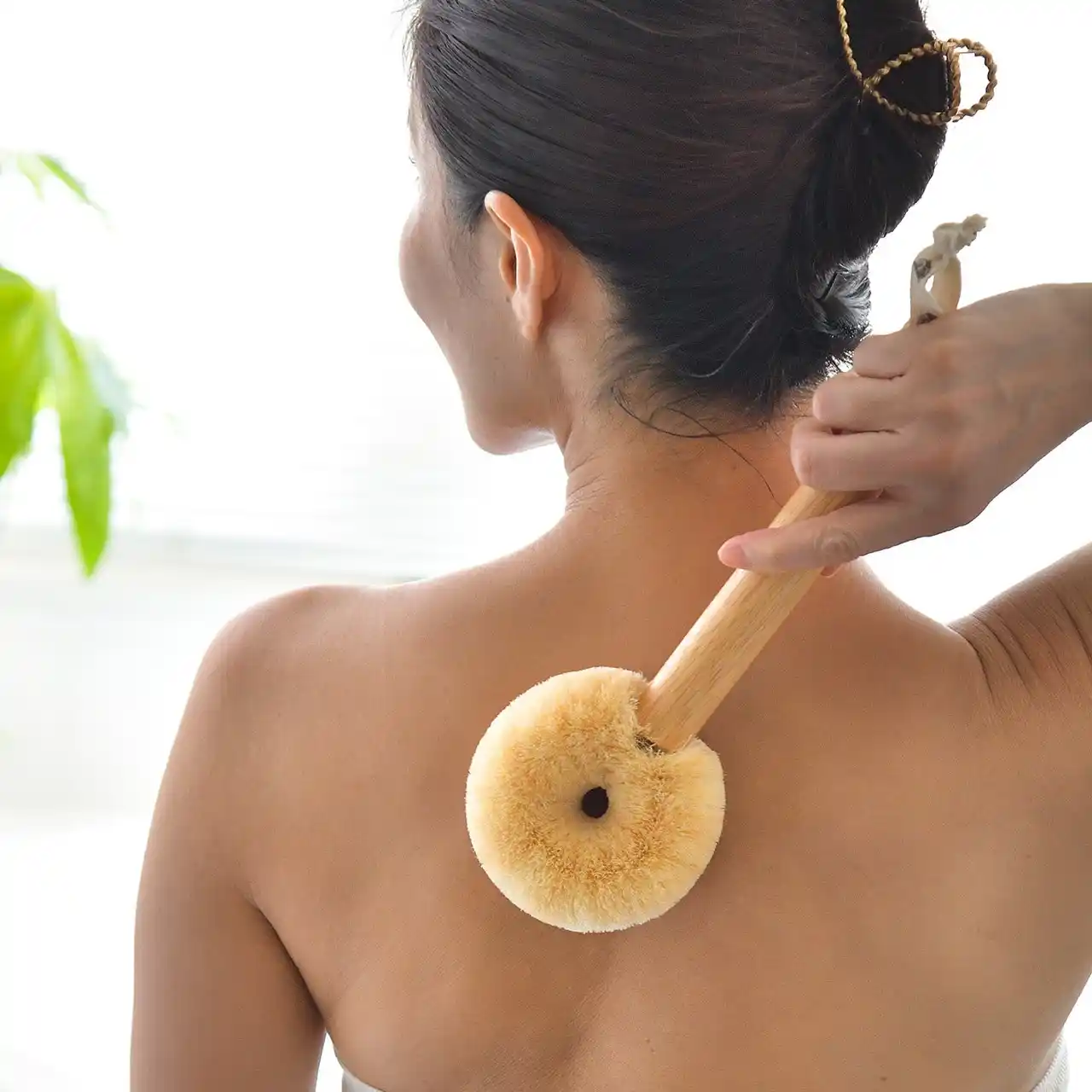【選べる2タイプ】 どちらの素材も手に持ちやすい丸いボディたわしで、手持ちタイプと、背中のケアなどに便利なハンドル付きの2種類をご用意しました。お好みの使い方に合わせてお選びいただけます。 |