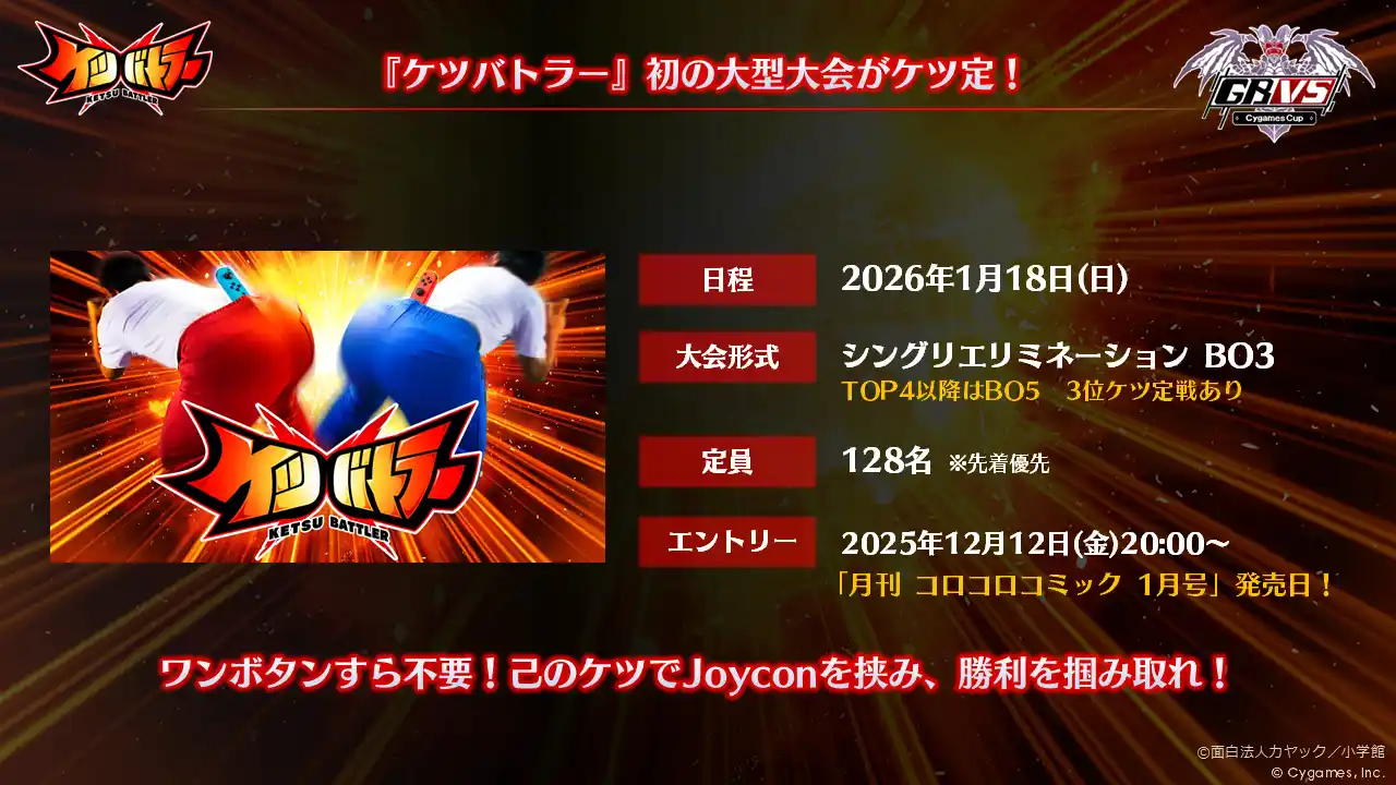 株式会社カヤック(本社:神奈川県鎌倉市、代表取締役CEO:柳澤大輔)は、Cygames主催の公式大会「GBVS Cygames Cup 2026」において、Nintendo Switch(TM)向けゲーム『ケツバトラー』史上初の公式大会を開催することをお知らせします。本大会は2026年1月18日(日)に開催予定となっており、本日12月12日(金)20時より、大会エントリーの受付を開始します。 |