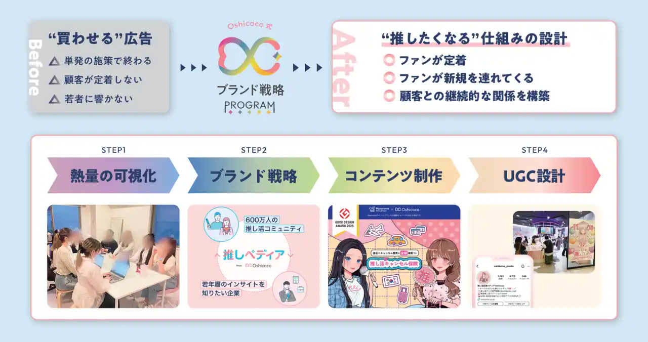 「すでにいるファンの熱量をもっと高めたい!」「これからファンを生み出していきたい!」そんな企業様と一緒に、中長期的に“推されるブランドづくり”を目指していきたい。それが、私たちOshicocoの想いであり、このプログラムが誕生した背景です。 |