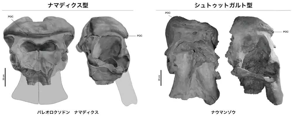 形態学的な研究から、パレオロクソドンには原始的な「シュトゥットガルト型」(頭の骨の隆起が弱い)と、派生的な「ナマディクス型」(頭の骨の隆起が強い)という2つの頭骨形態があり、その関係について長年論争が続いていました(図2)。 |