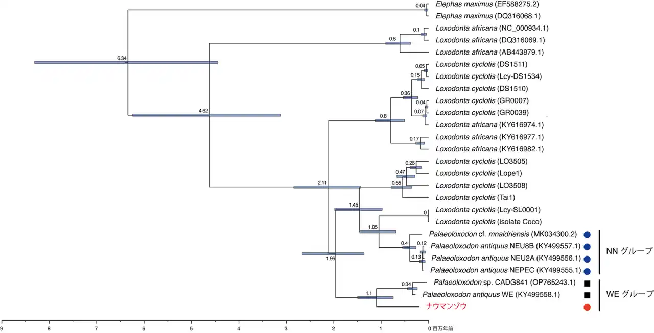 2個体のナウマンゾウのミトコンドリアゲノムのドラフト配列を用いて、他のゾウ類との系統的な関係を解析しました。その結果、2個体のナウマンゾウは一つのまとまった系統を形成し、さらにドイツや中国のパレオロクソドンとともにユーラシア全域に広がるWEグループを形成することが示されました。しかしナウマンゾウのDNAは、非常に厳しい環境下で数万年間埋蔵されていたためDNAの損傷が激しく、このドラフト配列そのものから分岐年代を推定することは困難でした。