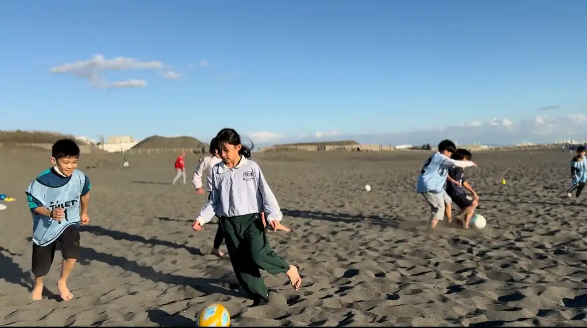 後半は、学びから一転、伸びやかに体を動かす時間へ。 裸足で砂浜を走り、笑顔でボールを追いかける子どもたち。 田中選手のプレーに目を輝かせながら、思い切り砂の感触を楽しみました。 |