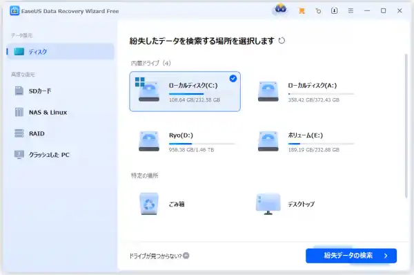 ステップ1.EaseUS Data Recovery Wizard Freeをインストールして起動します。次に、消えたデータが保存された元場所を選択して「紛失データの検索」をクリックしてください。