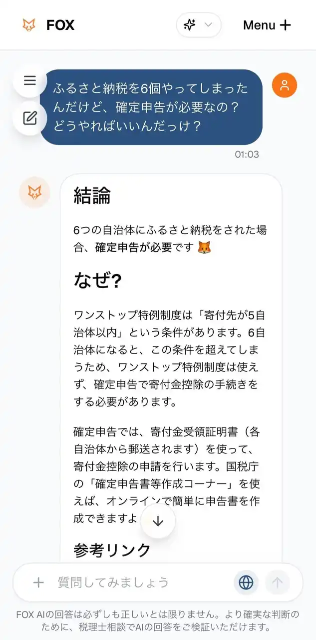 FOXは、政府公式の法令データベース「e-Gov法令」と直接連携します。確定申告などの質問を入力すると、最新の条文を取得し、「所得税法第○条によると『~』」と引用して回答します。それでも不安が残れば、ワンクリックで税理士に相談可能です。 |