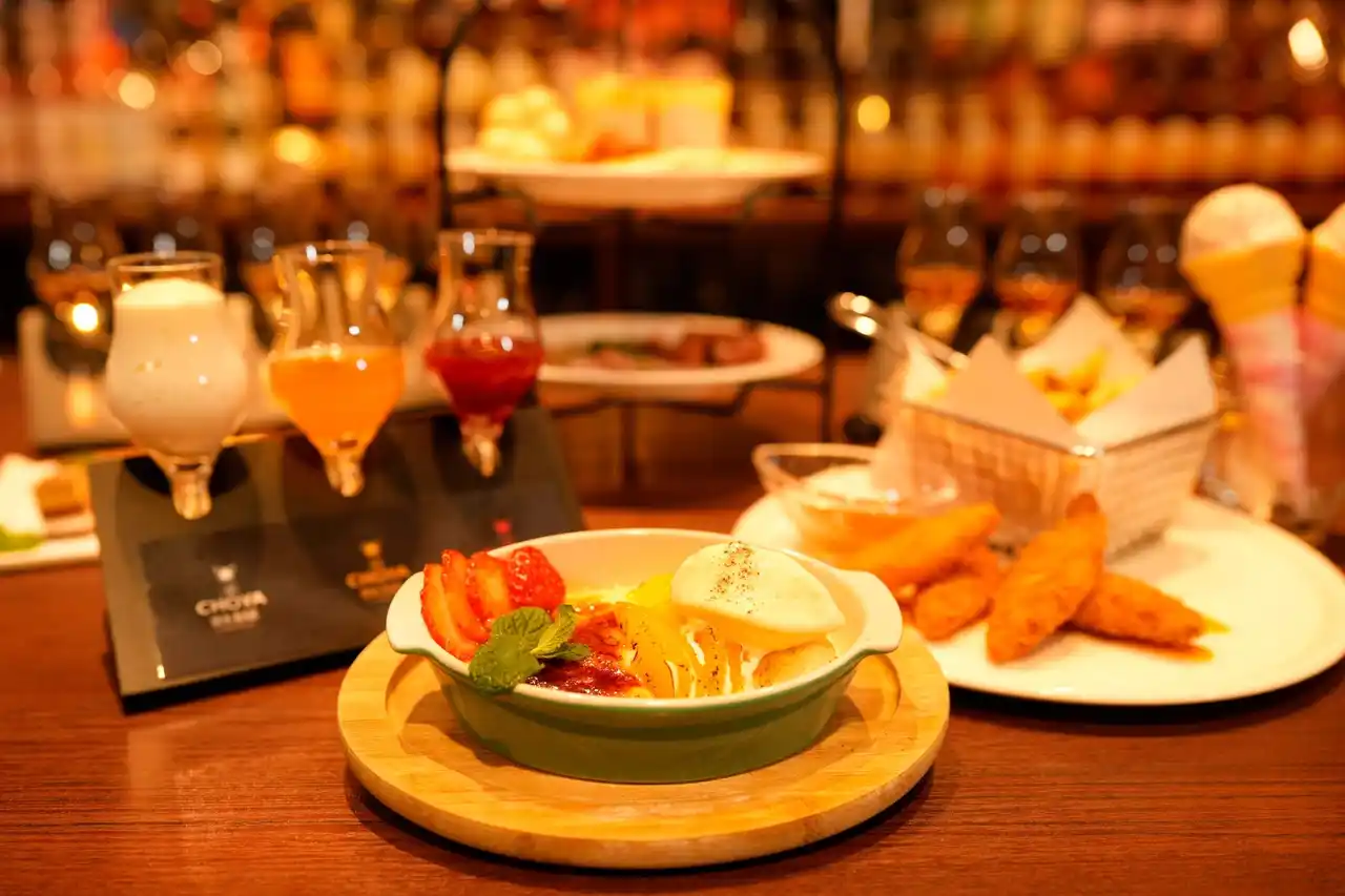 新作梅スイーツ「CHOYA とろける梅フルーツグラタン」は、アルコール入りの酔うタイプとノンアルコールの酔わないタイプからお選びいただけます。また、梅をアレンジしたフードや梅酒との相性を考えたオードブルやスイーツに、3~5種類の利き梅酒が楽しめるフライトセットや人気の梅酒カクテルにノンアルコール梅酒カクテルなど、100種類以上のドリンクが2時間30分飲み放題