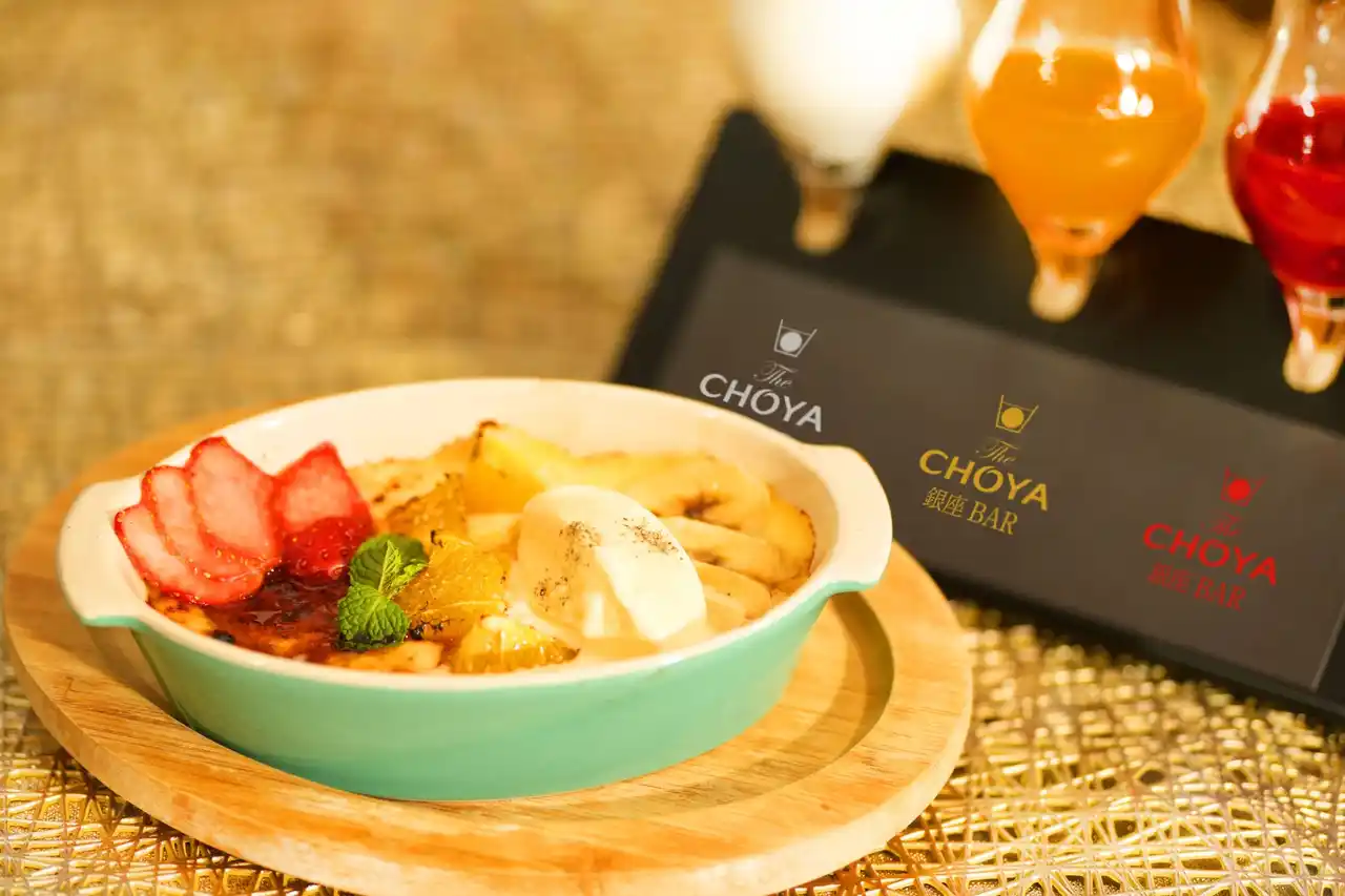 チョーヤ梅酒株式会社 (本社:大阪府羽曳野市、社長:金銅重弘、以下チョーヤ) は、梅酒カクテル専門店「The CHOYA 銀座BAR (ザ チョーヤ ギンザバー) 」にて、厳選した梅素材にクレームブリュレとフルーツグラタンを融合させ、南高梅を使用した3種類のオリジナルシロップと楽しむ、新感覚スイーツ「CHOYA とろける梅フルーツグラタン」を2025年12月18日 (木) から2026年2月27日 (金) まで期間限定で販売します。寒さ厳しい冬の季節に、オーブンで焼き上げたフルーツのやさしい酸味と、濃厚なカスタードクリームのとろける甘み。心まで温める贅沢なひとときをお届けします。 |