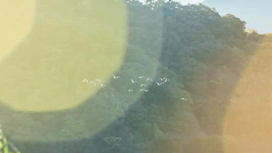 木漏れ日の中を一斉に飛び立つ野鳥たち |